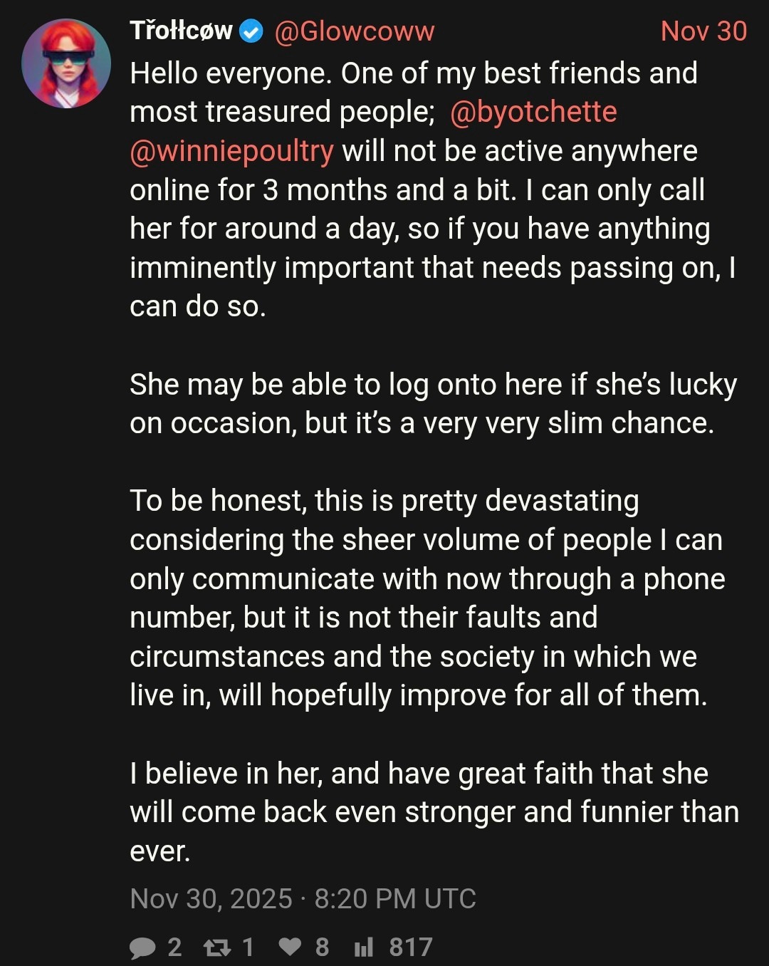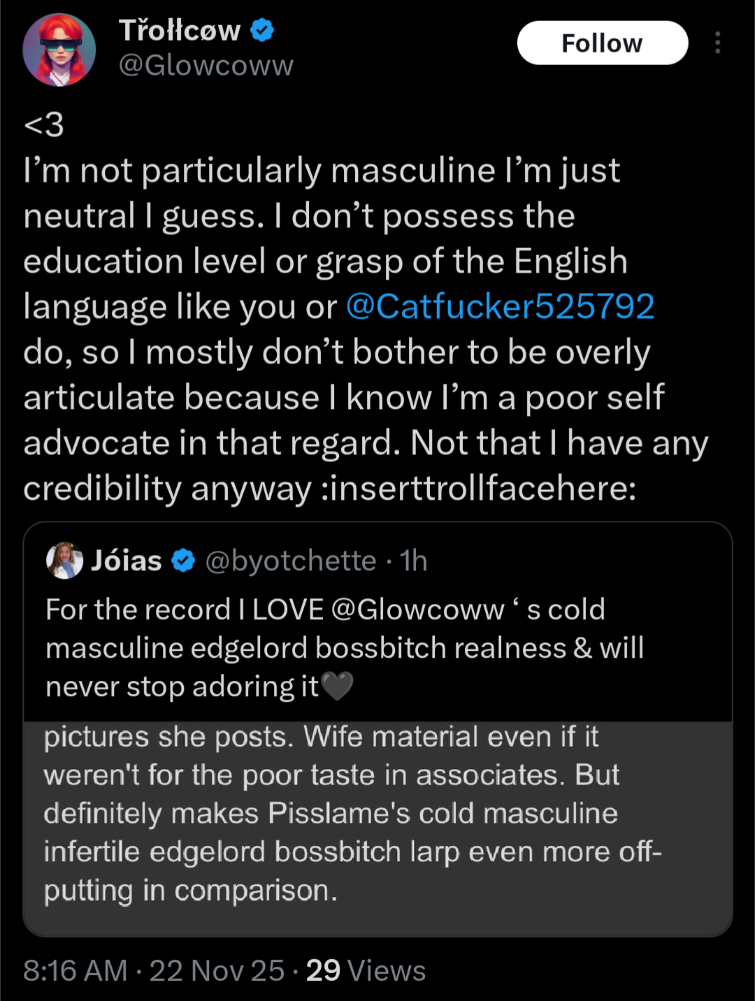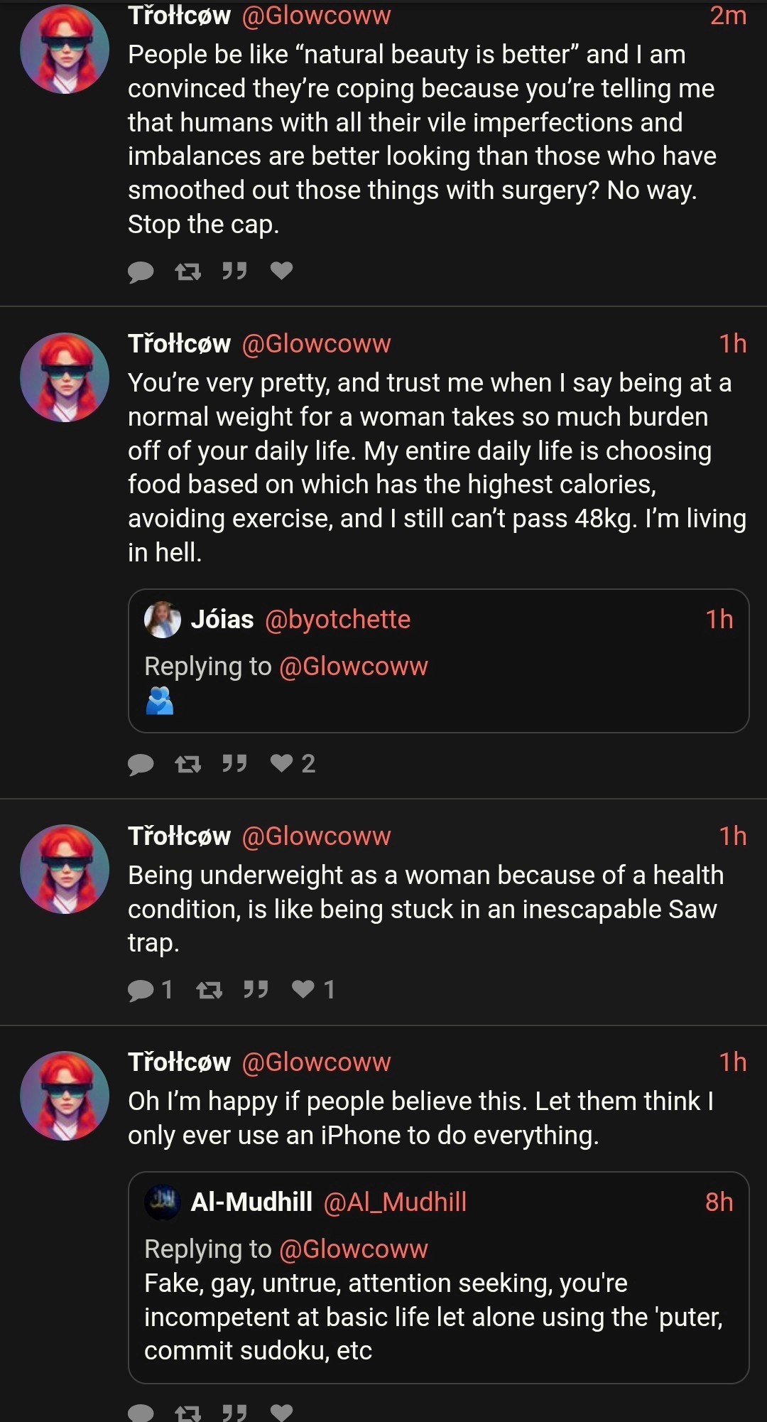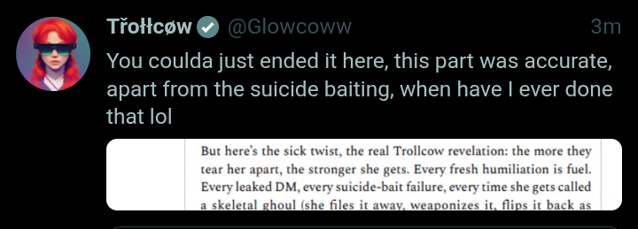 I am a woman, yes, but I am also a warrior, a warrior who has faced the darkness and emerged victorious. I have faced the ugliness of the world, the ugliness of the incels, and I have emerged unscathed. I have faced the darkness of the internet, the darkness of the discord, and I have emerged unscathed. I have faced the darkness of my own mind, the darkness of my own soul, and I have emerged unscathed.